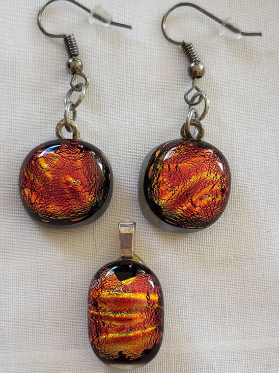 Komplet biżuterii szklanej składa się z zawieszki oraz dwóch kolczyków. Szkło dichroiczne. Bigle wykonane są ze stali chirugicznej. Waga kolczyka ok. 4 g, długość 4,5 cm. Waga zawieszki 3 g, długość 2,5 cm.