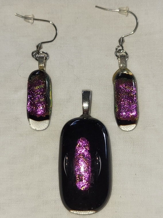 Komplet biżuterii szklanej składa się z zawieszki oraz dwóch kolczyków. Szkło dichroiczne. Bigle wykonane są ze stali chirugicznej. Waga kolczyka ok. 3 g, długość 4,5 cm. Waga zawieszki 11 g, długość 4,5 cm.