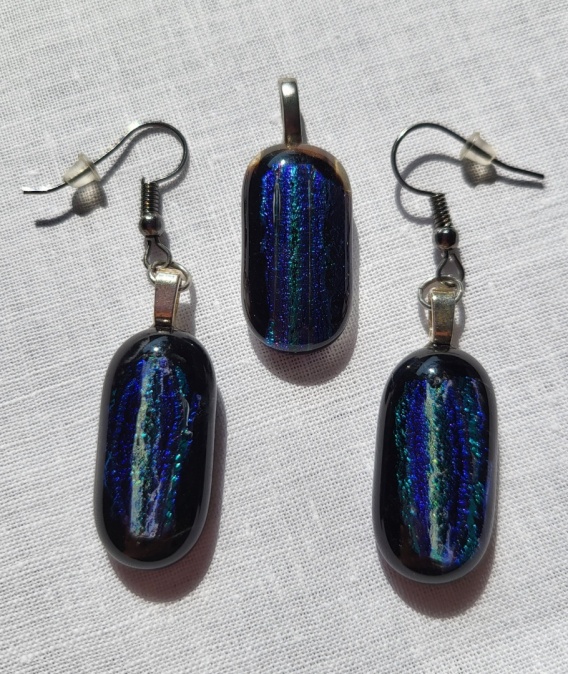 Komplet biżuterii szklanej składa sie z zawieszki i dwóch kolczyków. Szkło dichroiczne. Bigle kolczyków wykonane są ze stali chirurgicznej. Waga kolczyka ok. 4,5 g, długość 5 cm. Waga zawieszki 4 g, długość 3,5 cm.