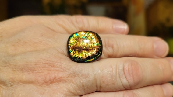 Pierścionek  ze szkła fusingowego oraz dichroicznego. Baza pierścionka stal chirurgiczna z regulacją. Waga ok.8 g, długość ok 1,5  cm.
