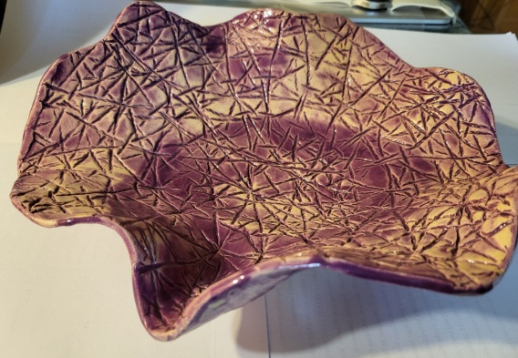 Patera z gliny wypalona w piecu dwukrotnie, szkliwiona. Długość 29 cm, szerokość 24 cm wysokość 8 cm.