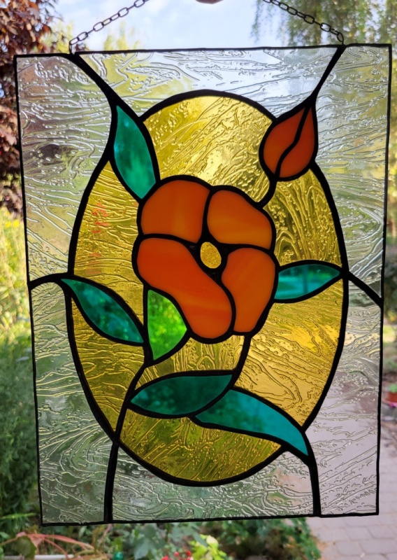 Witraż wykonany metodą Tiffany'ego. Szerokość 25,5 cm, wysokość 33,5 cm. Posiada łańcuszek do zawieszenia.