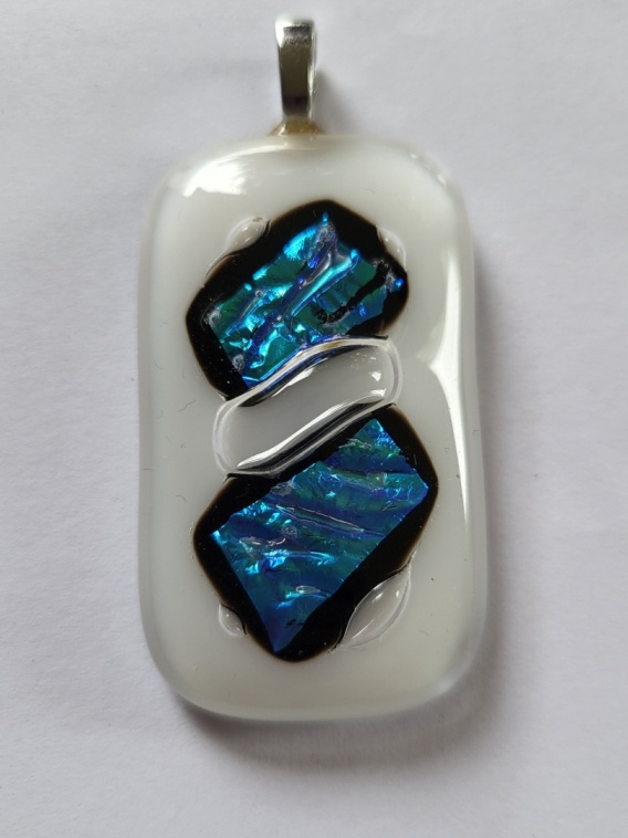 Zawieszka ze szkła fusingowego oraz dichroicznego. Waga zawieszki 21 g, długość 5,5cm.