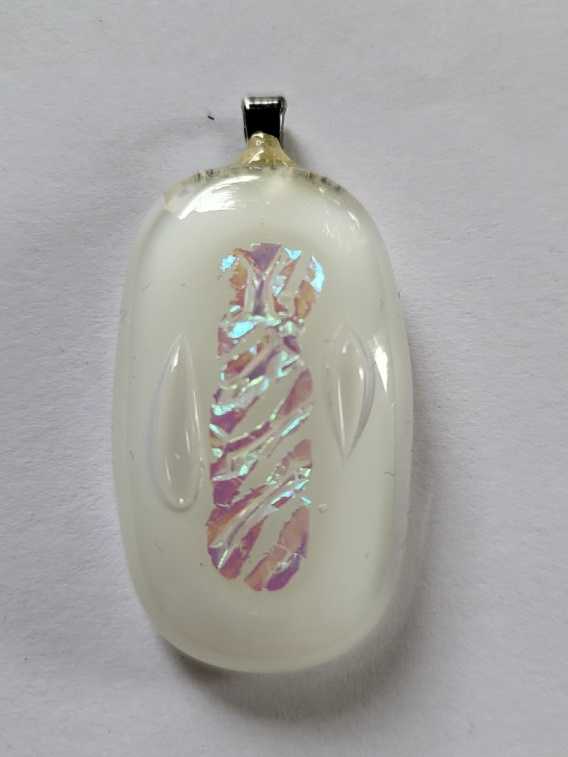 Zawieszka ze szkła fusingowego oraz dichroicznego. Waga zawieszki 12 g, długość 4 cm.